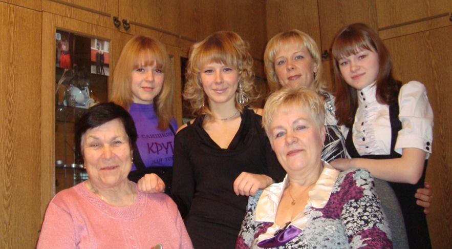 Внизу – Кузнецова В.А. (слева), Смертина О.И - дочь Кузнецовой В.А. (справа), вверху слева направо – правнучки Кузнецовой В.А. -Митрофанова Д.А., Ярославцева К.А., внучка -Митрофанова М.Л., правнучка Тресцова В.С., 2010 г.